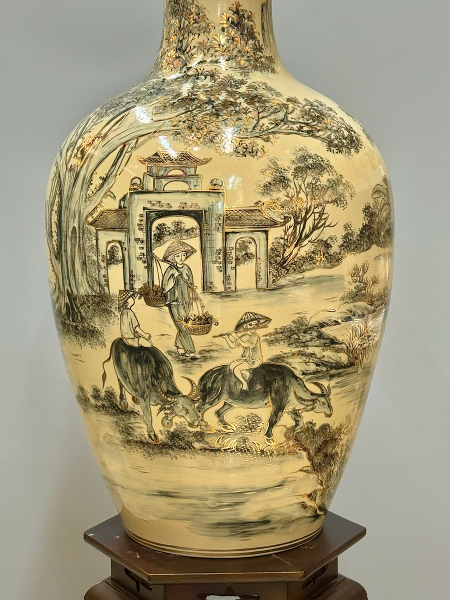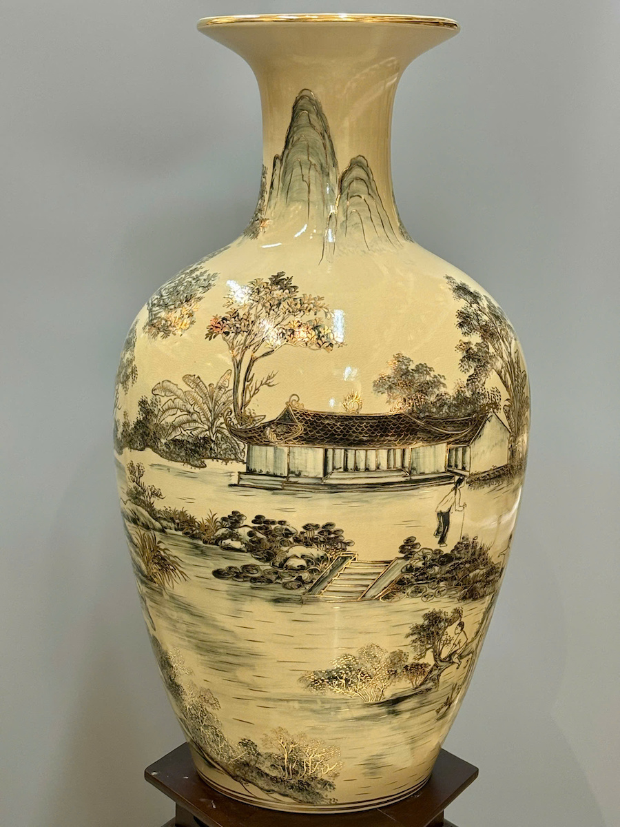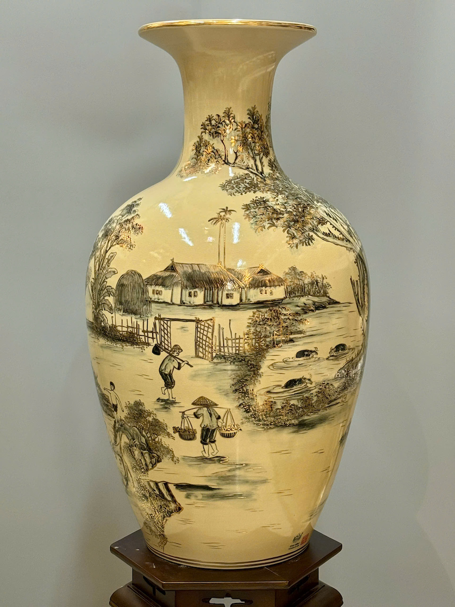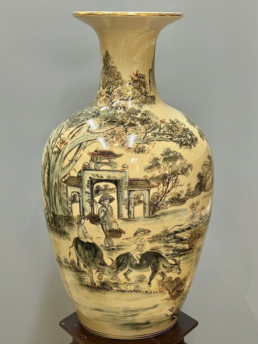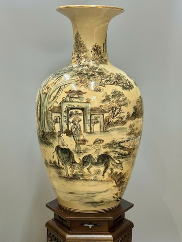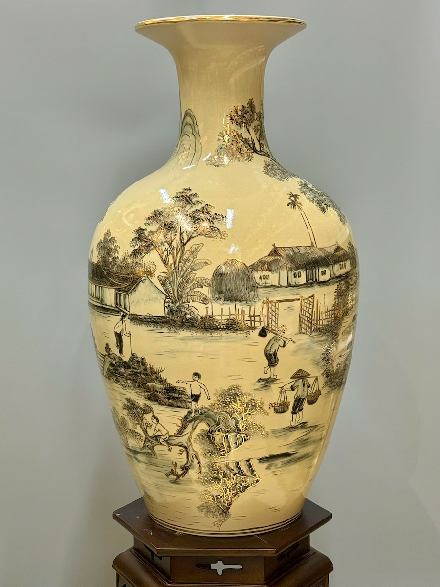 Bảo Bình Cảnh Làng Quê Cao 80cm Gốm Chu Đậu Vẽ Vàng