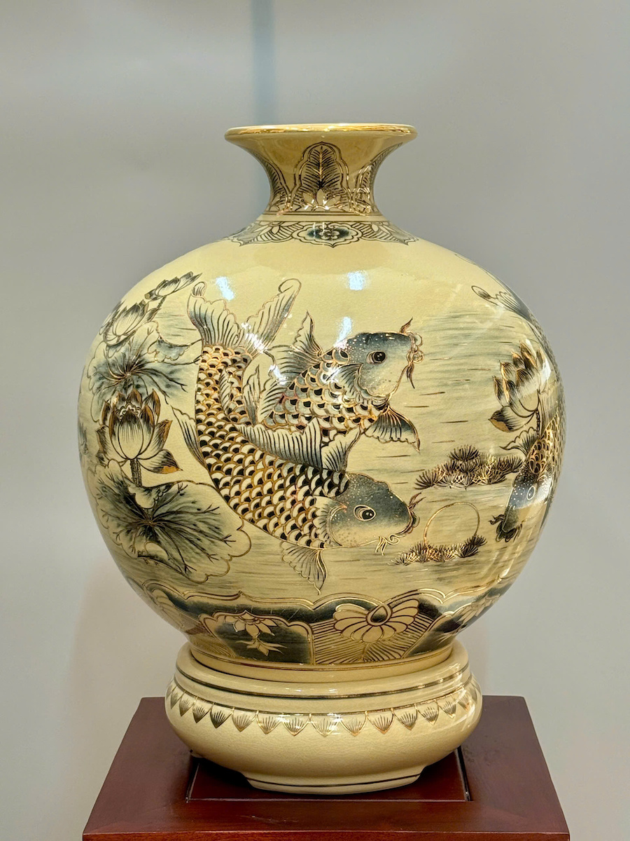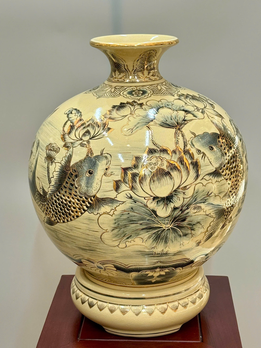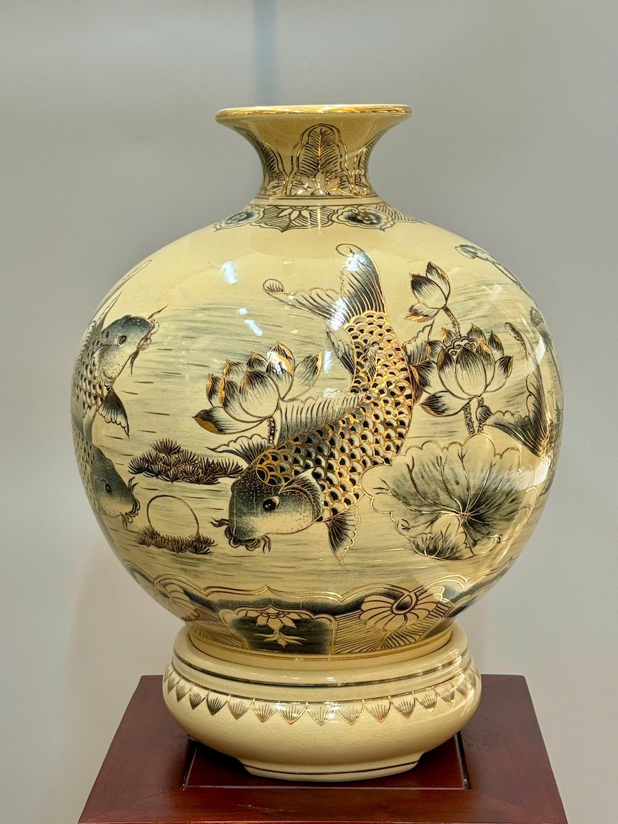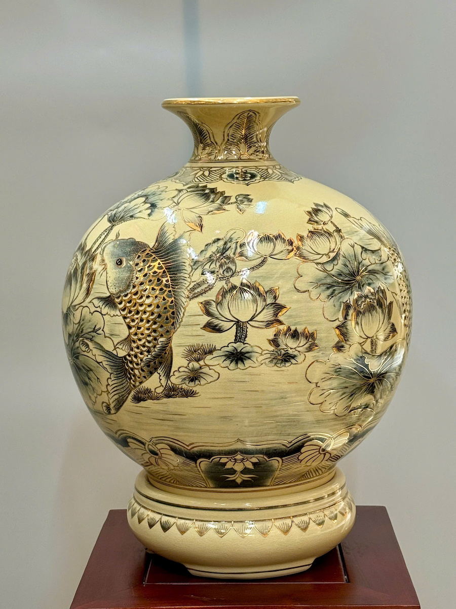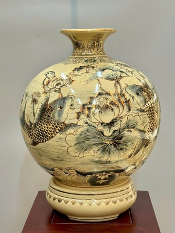 Bình Hút Lộc Cá Chép Hoa Sen Cao 42cm Gốm Chu Đậu Vẽ Vàng