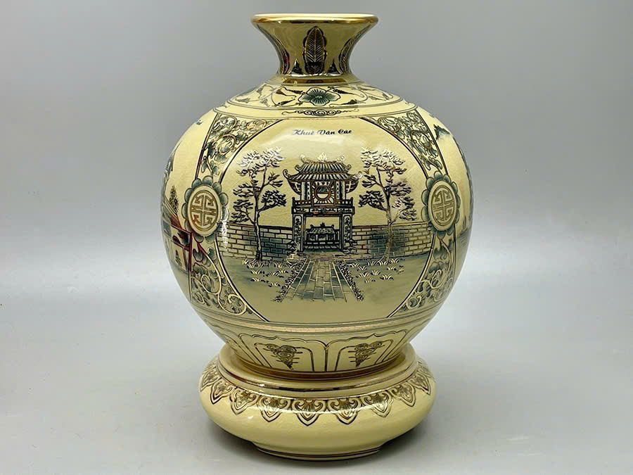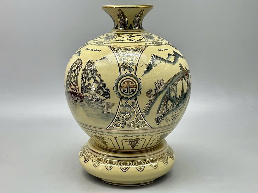 2. **Họa tiết vẽ tay tinh xảo**: Các họa tiết trên bình được vẽ thủ công bằng vàng 24k, mang lại vẻ đẹp lấp lánh và độc đáo.