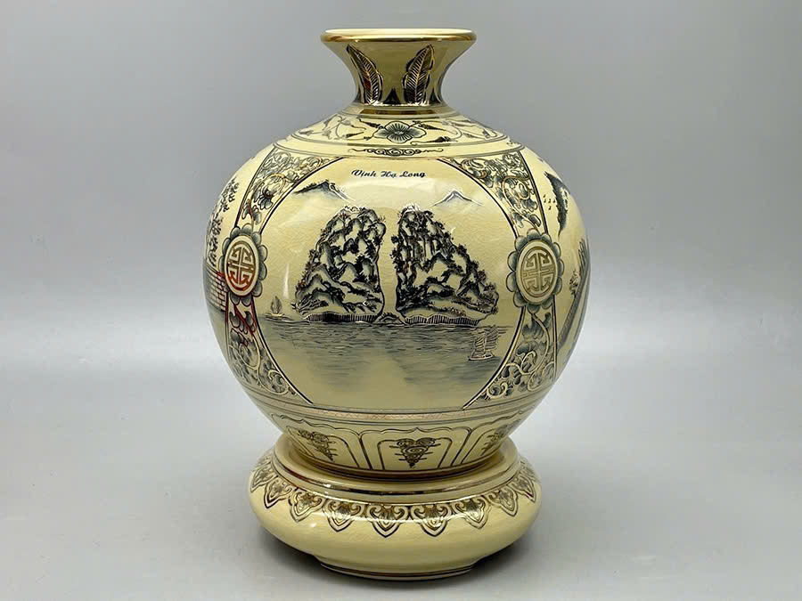 Bình gốm Chu Đậu vẽ vàng 24k là một sản phẩm gốm sứ cao cấp, mang đậm nét tinh hoa của làng gốm Chu Đậu - một trong những làng gốm cổ nổi tiếng của Việt Nam. Sản phẩm này không chỉ thể hiện sự tinh xảo trong kỹ thuật chế tác gốm mà còn được điểm xuyết bằng những họa tiết vẽ tay tinh tế với vàng 24k, tạo nên vẻ đẹp sang trọng và quý phái.