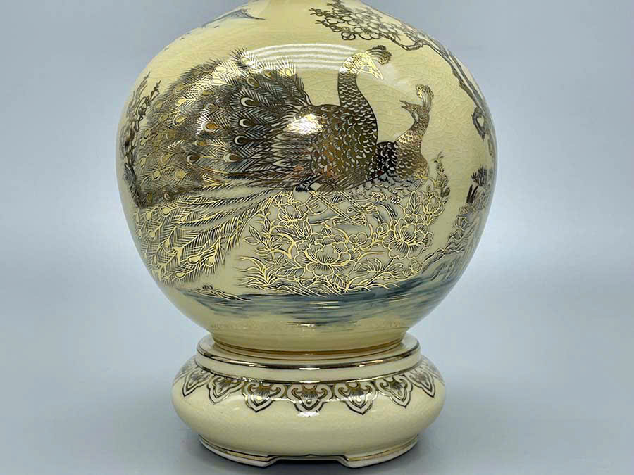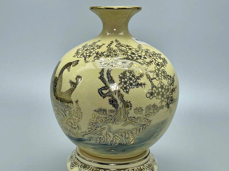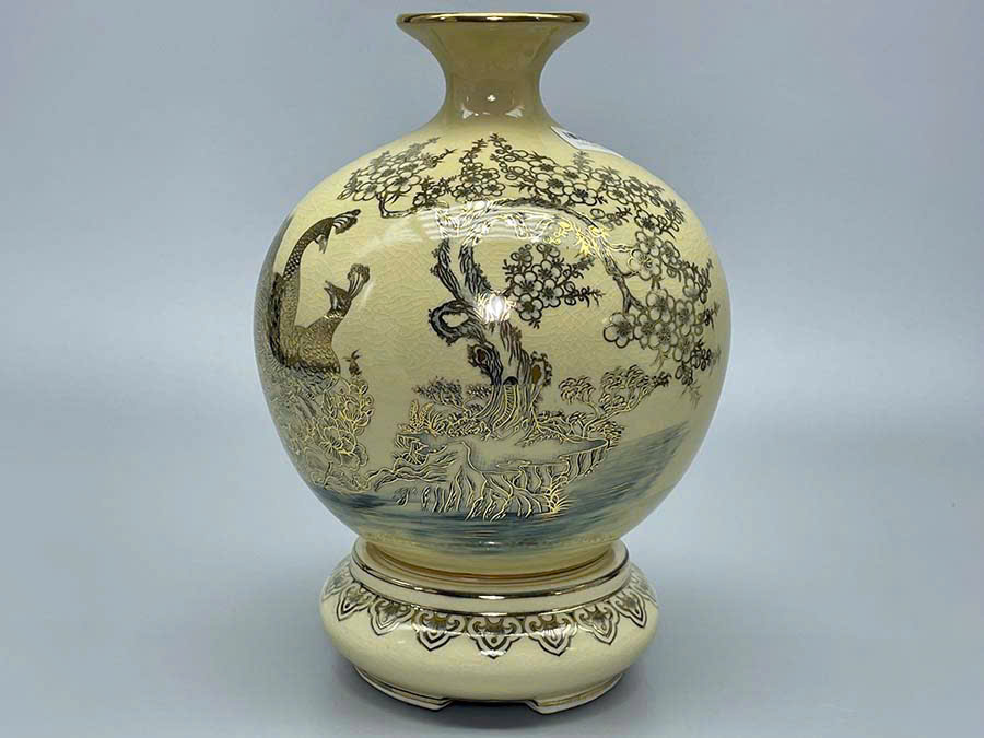 2. **Họa tiết vẽ tay tinh xảo**: Các họa tiết trên bình được vẽ thủ công bằng vàng 24k, mang lại vẻ đẹp lấp lánh và độc đáo.