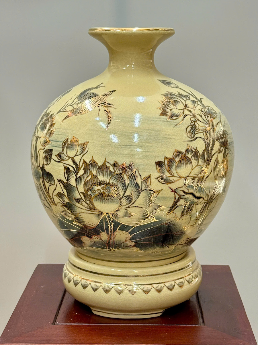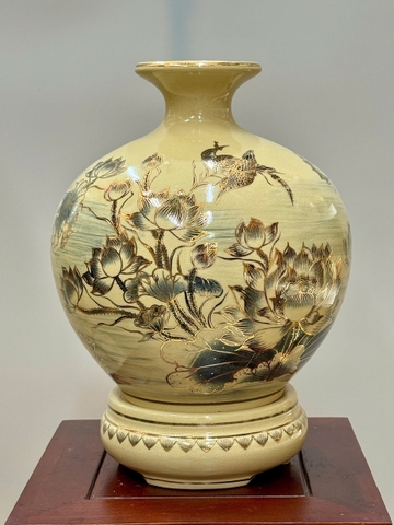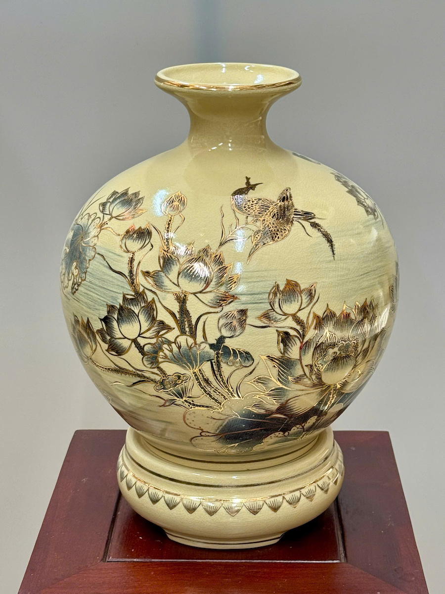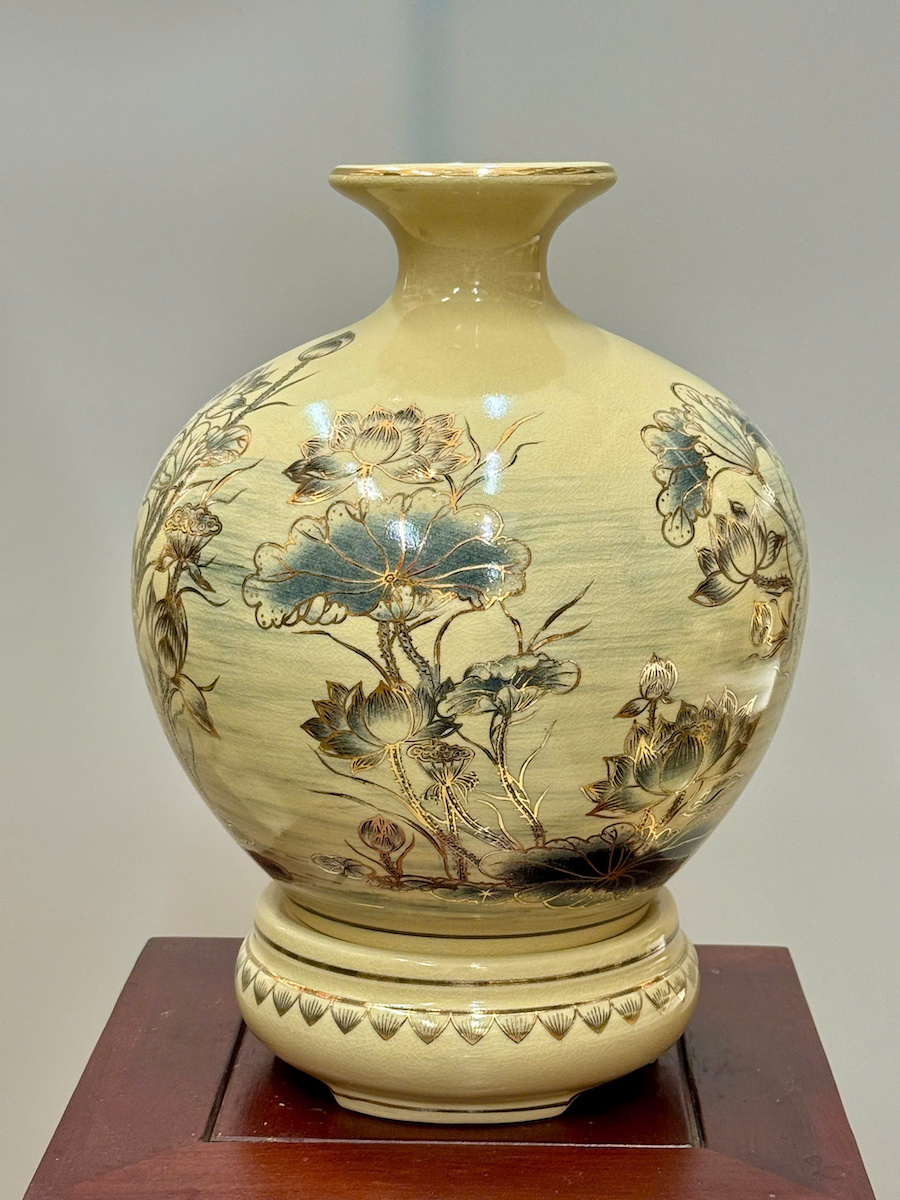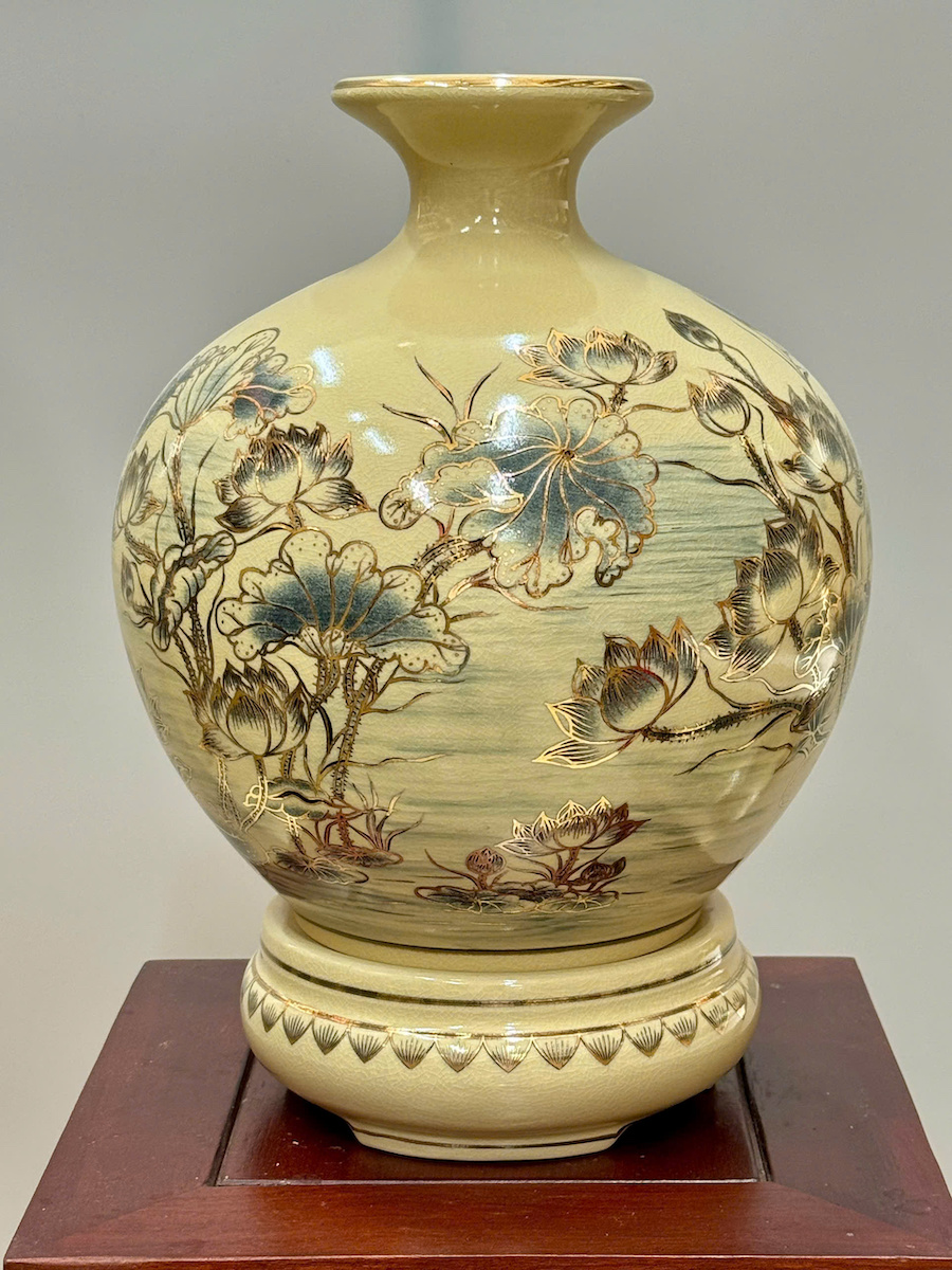 Bình Hút Lộc Hoa Sen Cao 36cm Gốm Chu Đậu Vẽ Vàng
