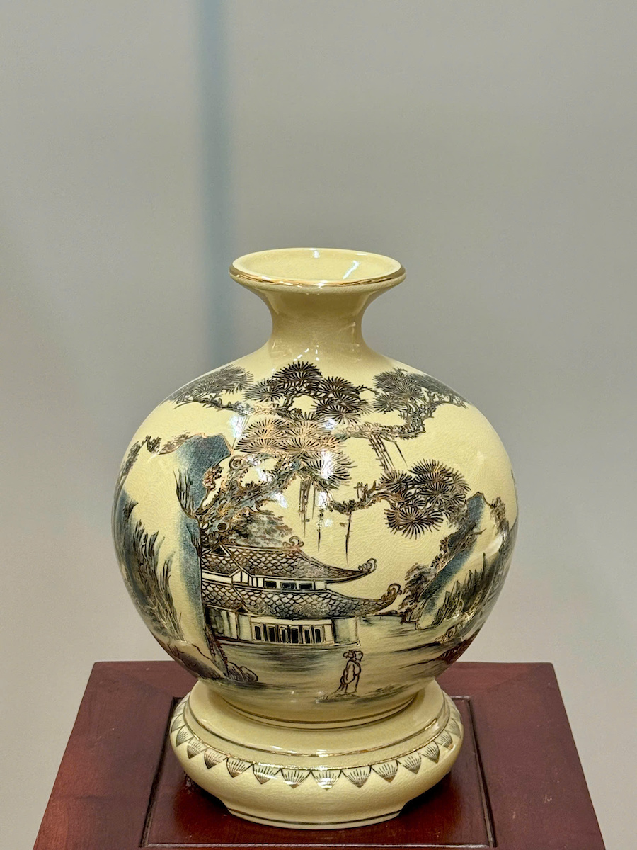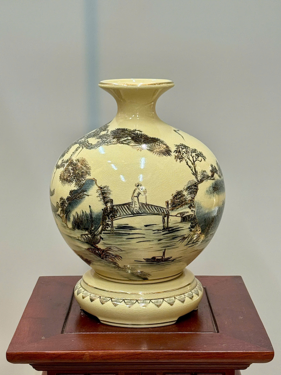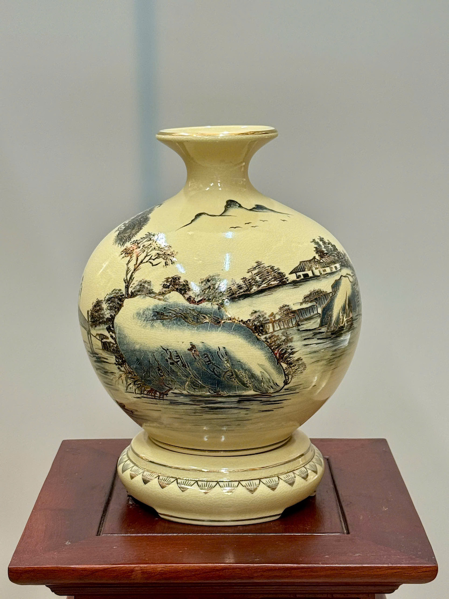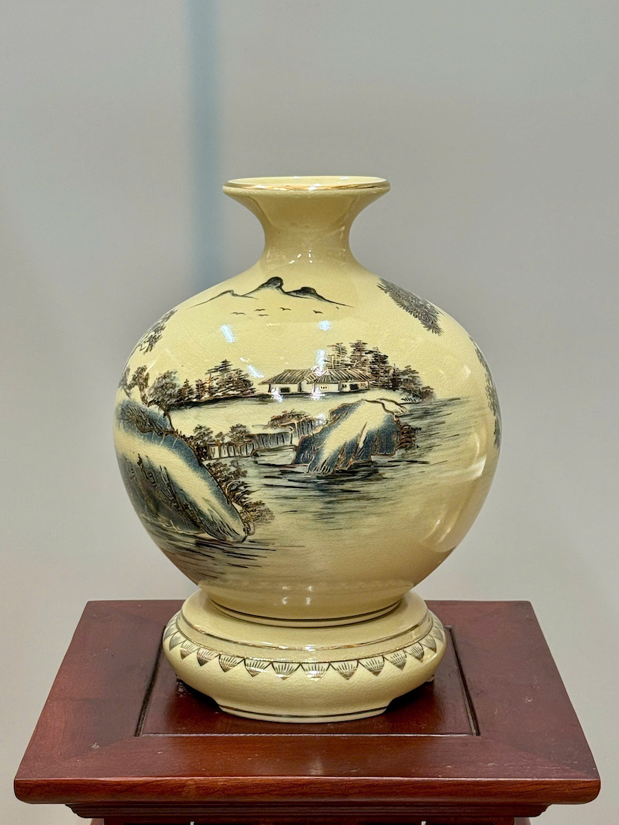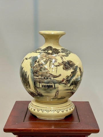 Bình Hút Lộc Sơn Thuỷ Hữu Tình Cao 29cm Gốm Chu Đậu Vẽ Vàng