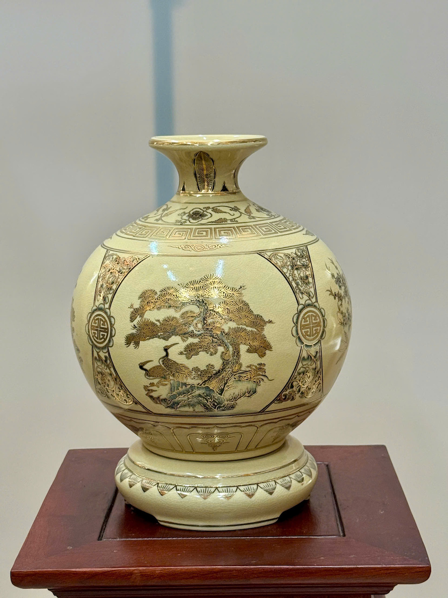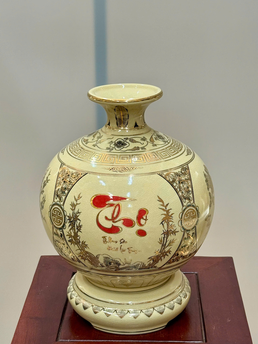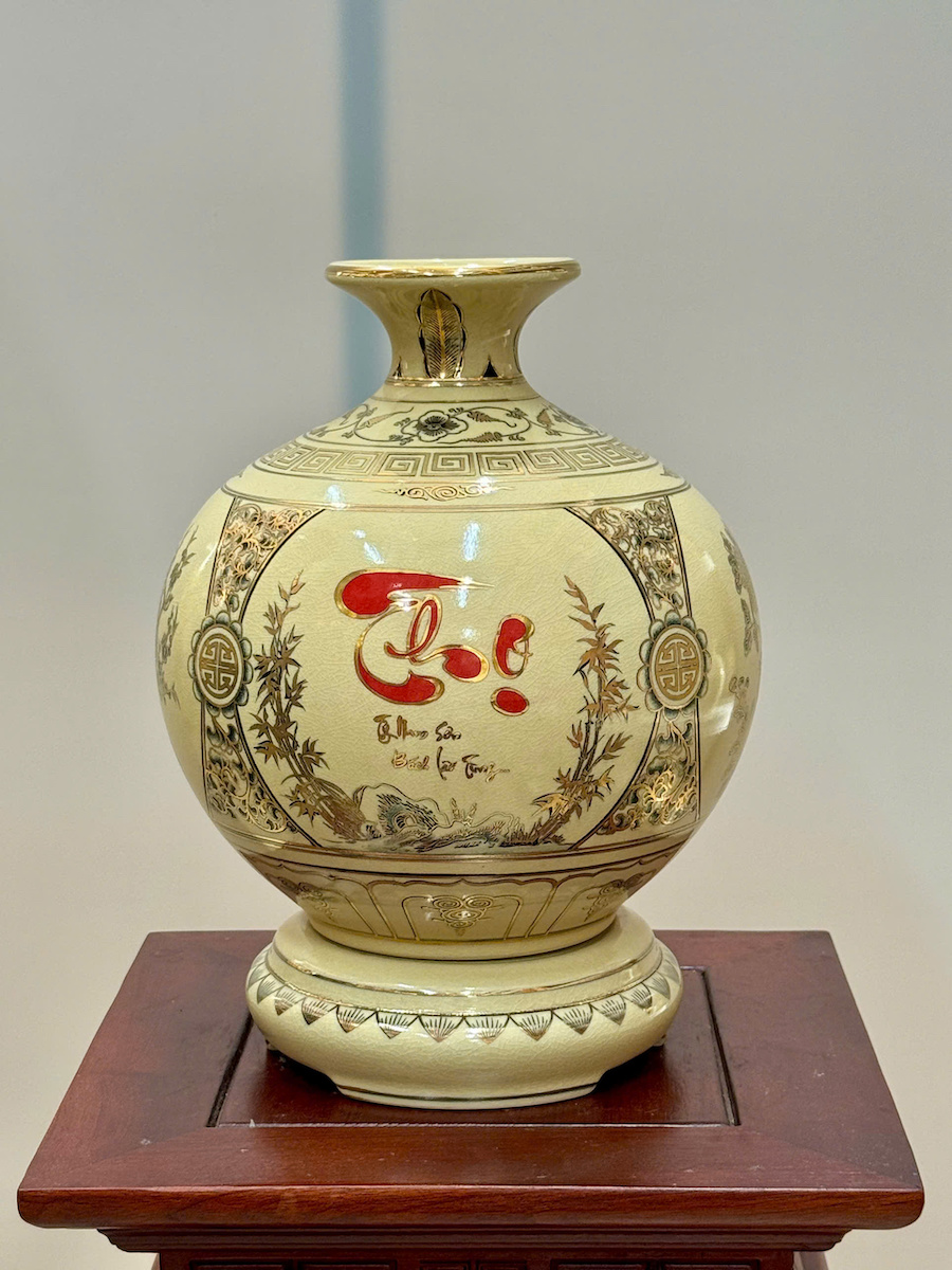 Bình Hút Lộc Tứ Cảnh Chữ Thọ Cao 29cm Gốm Chu Đậu Vẽ Vàng