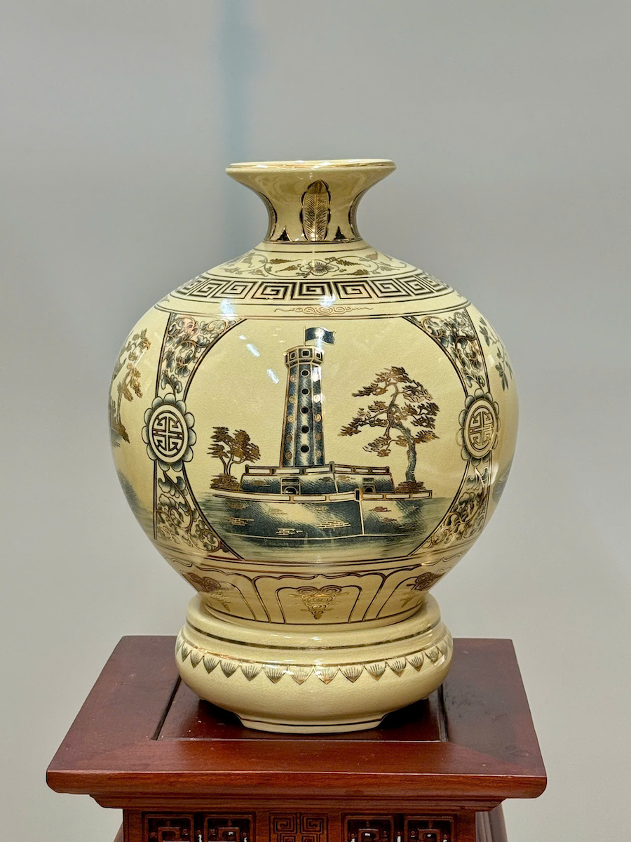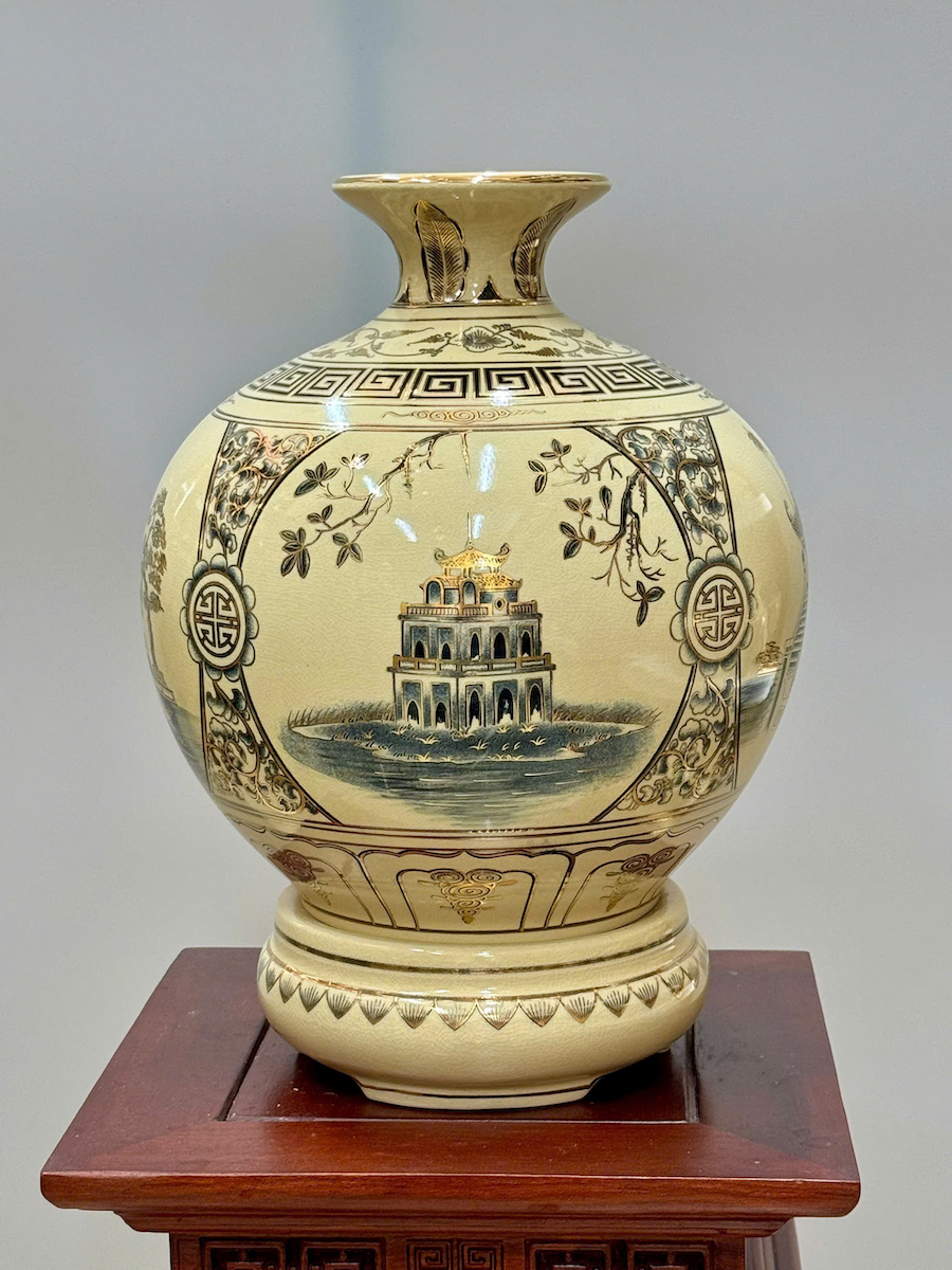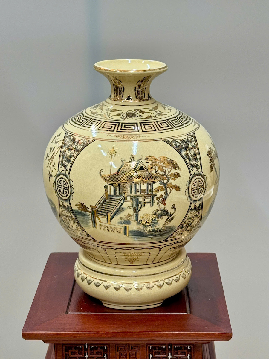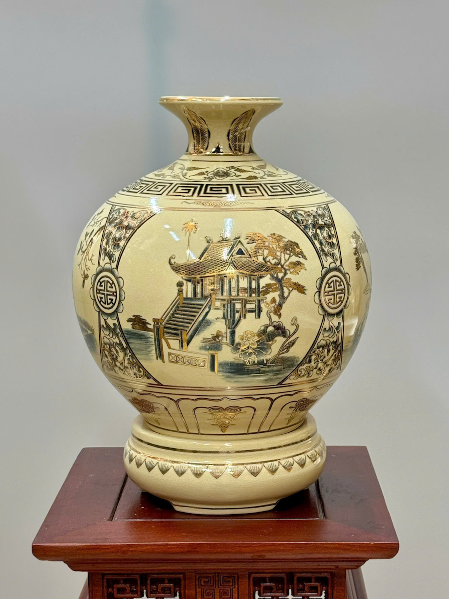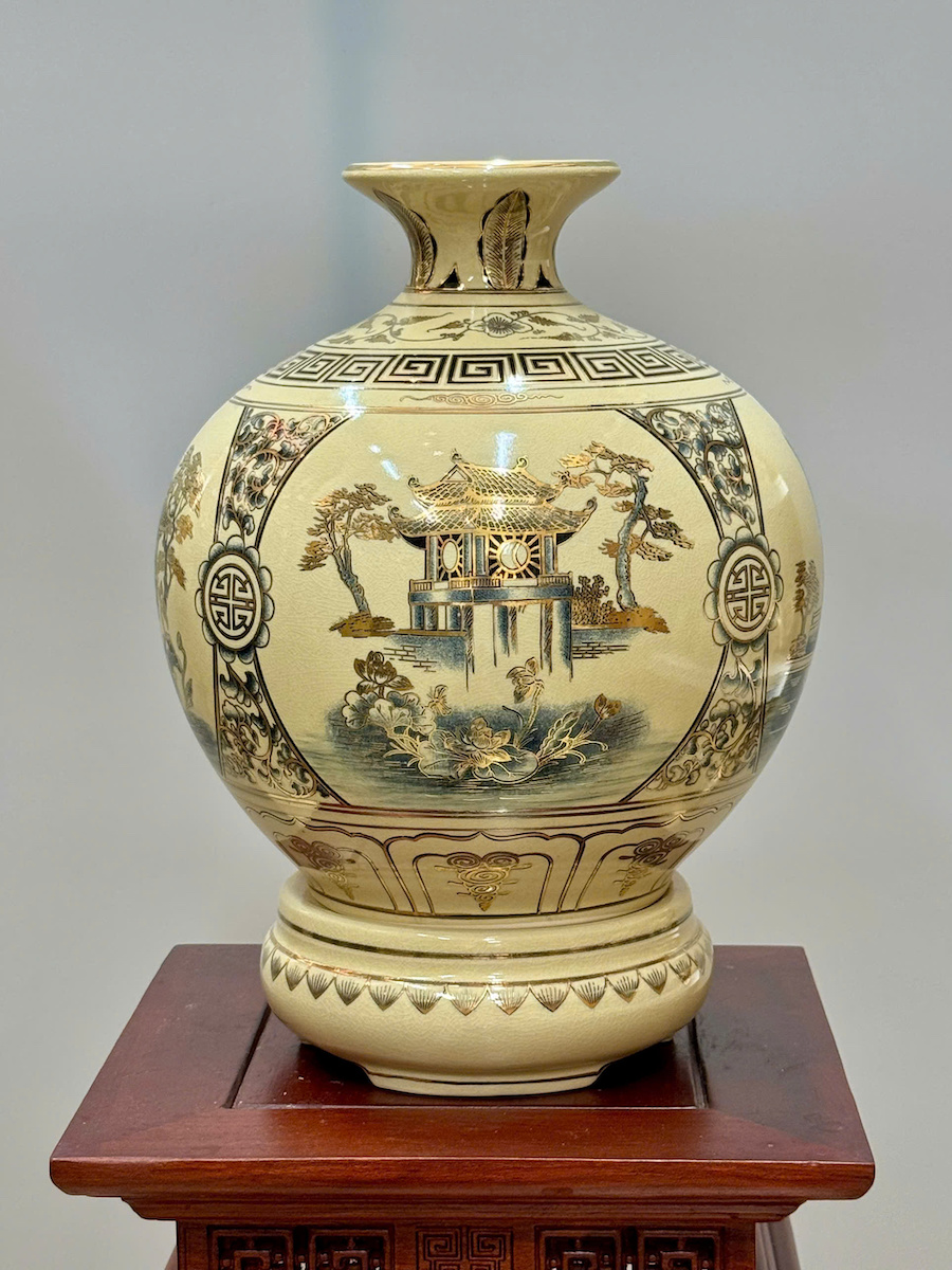 Bình Hút Lộc Tứ Cảnh Hà Nội Cao 36cm Gốm Chu Đậu Vẽ Vàng