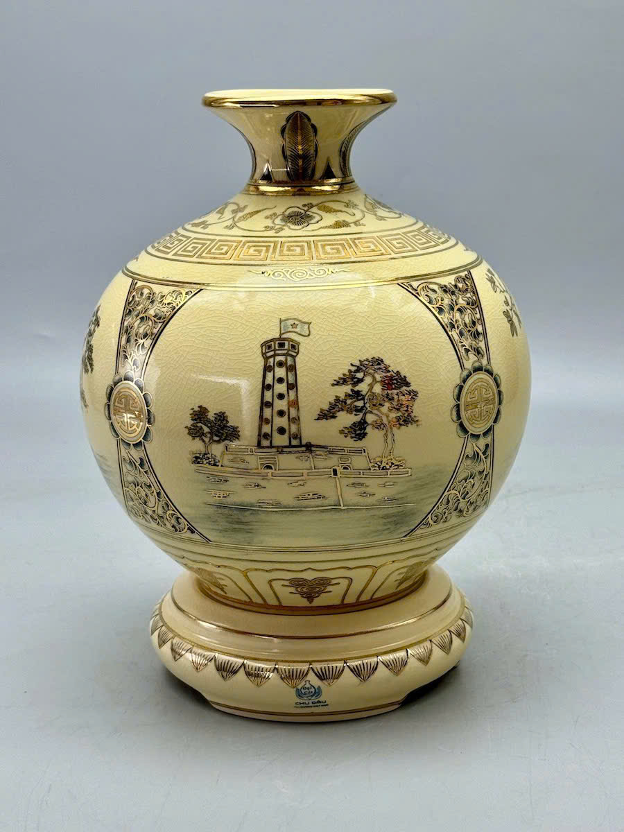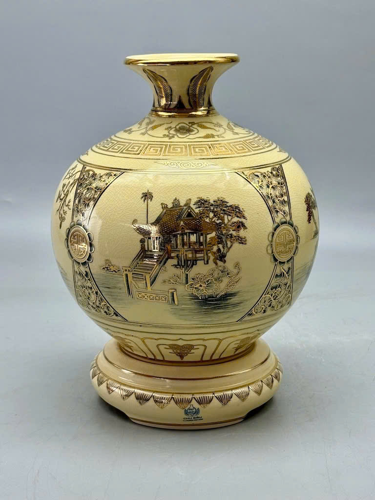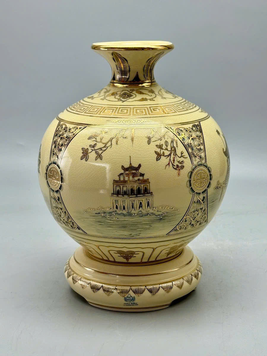 • Bình gốm Chu Đậu vẽ vàng 24k là một sản phẩm gốm sứ cao cấp, mang đậm nét tinh hoa của làng gốm Chu Đậu - một trong những làng gốm cổ nổi tiếng của Việt Nam. Sản phẩm này không chỉ thể hiện sự tinh xảo trong kỹ thuật chế tác gốm mà còn được điểm xuyết bằng những họa tiết vẽ tay tinh tế với vàng 24k, tạo nên vẻ đẹp sang trọng và quý phái.