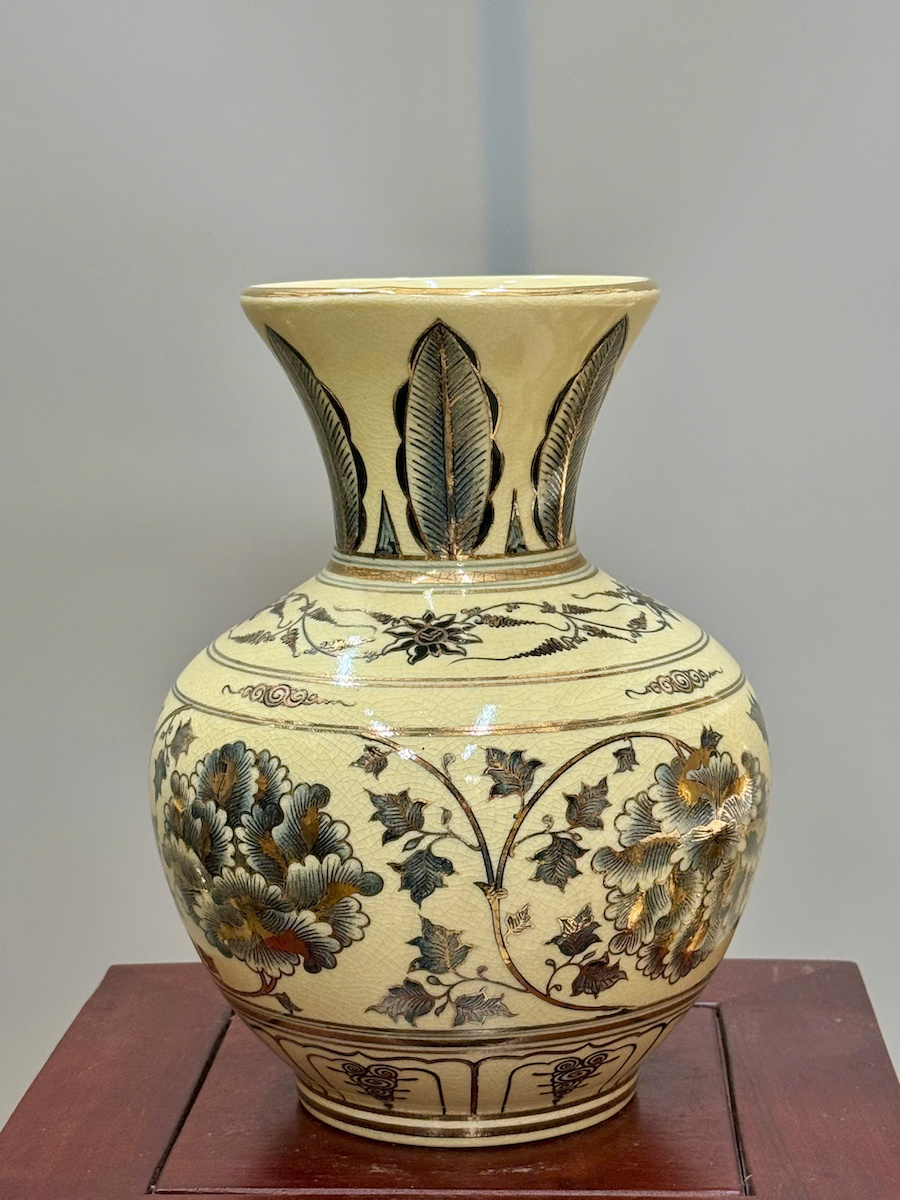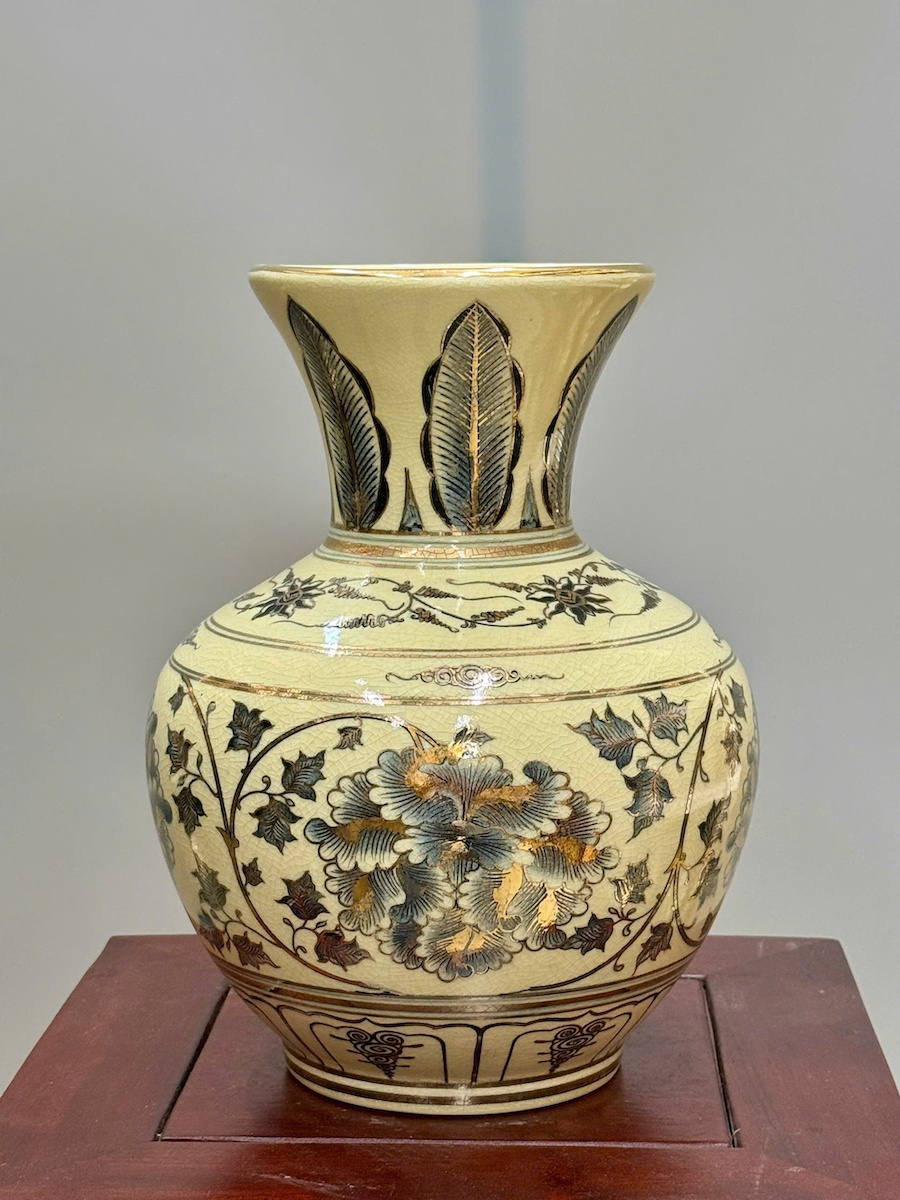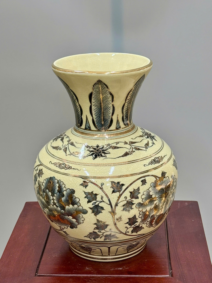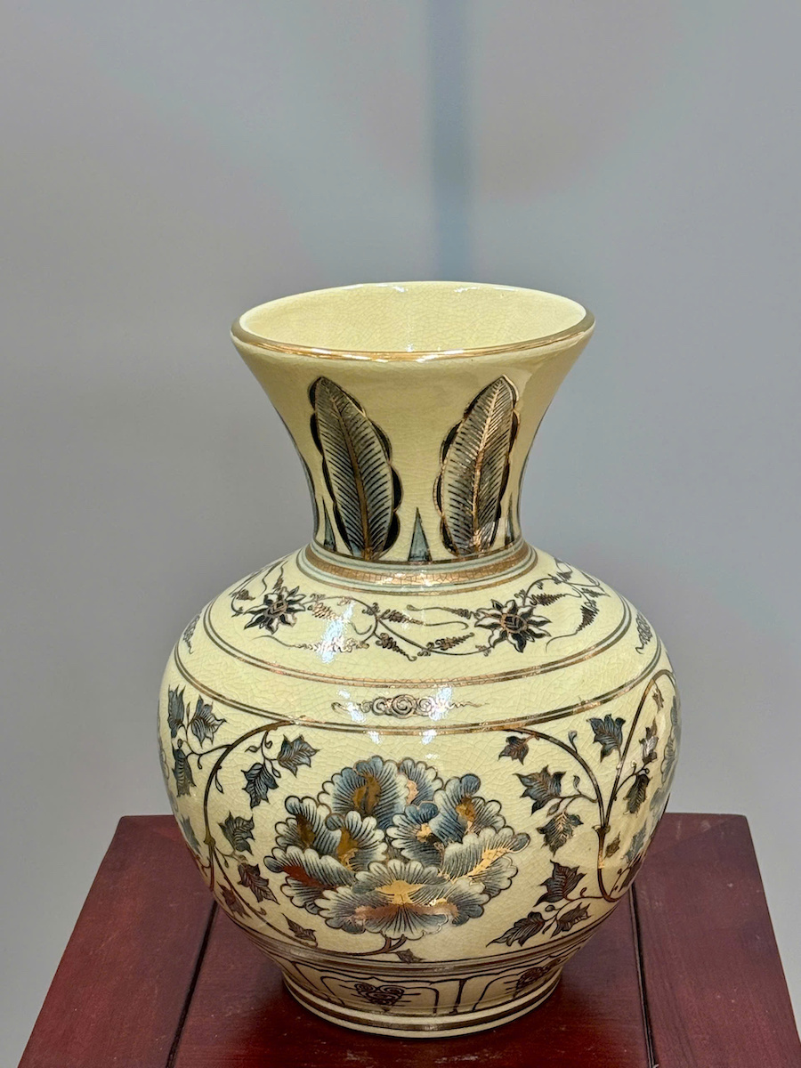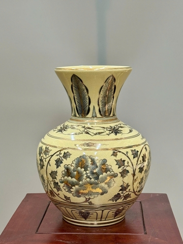 Bình Trường Phúc Hoa Phù Dung Cao 28cm Gốm Chu Đậu Vẽ Vàng