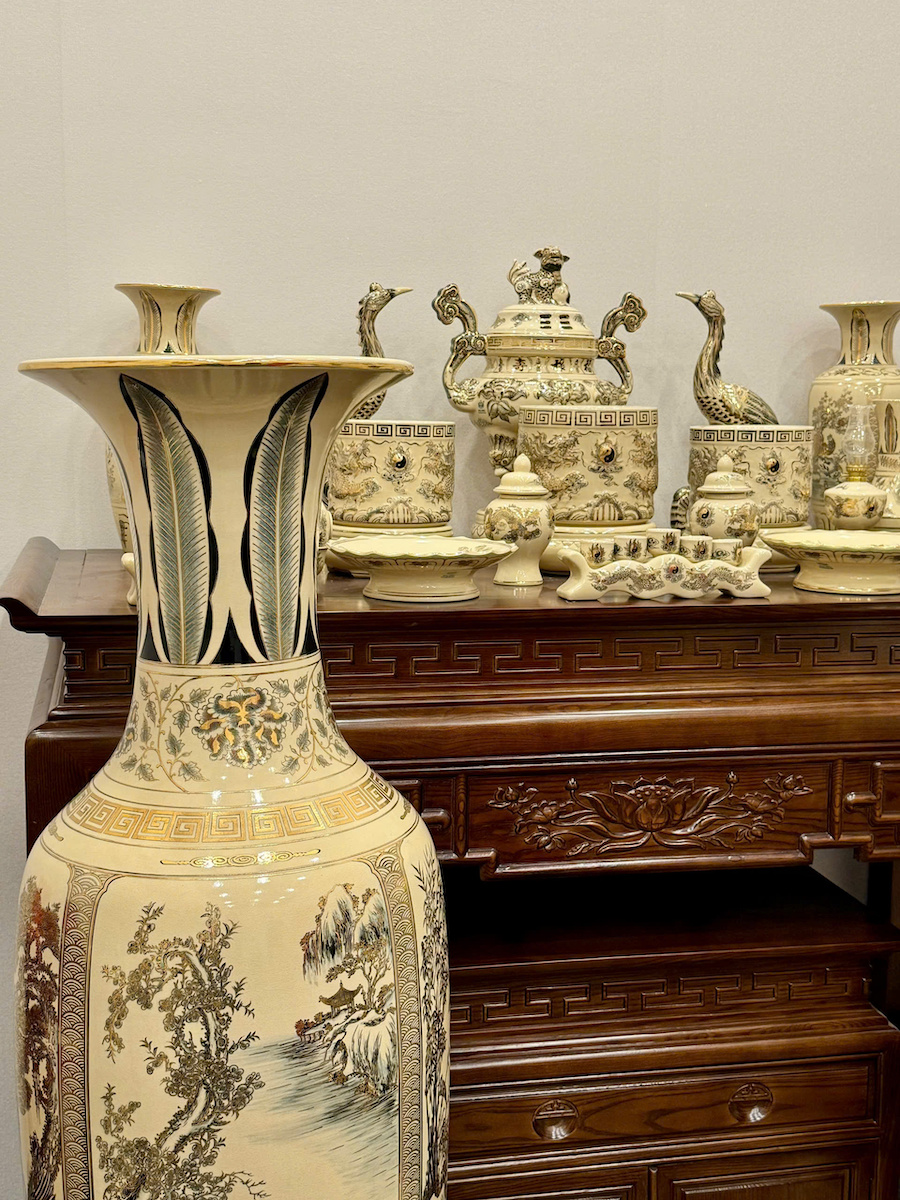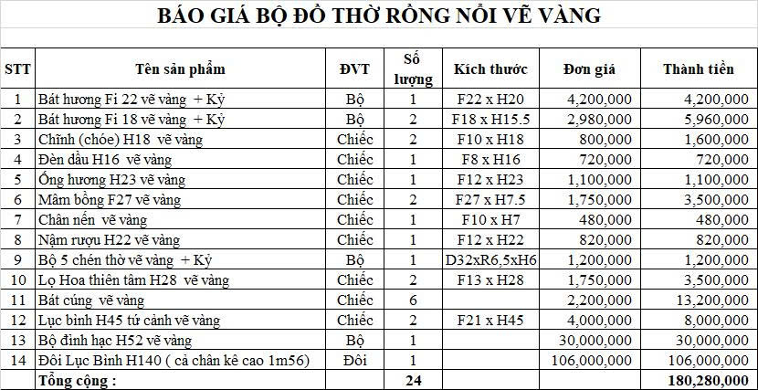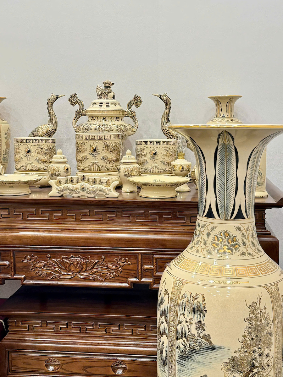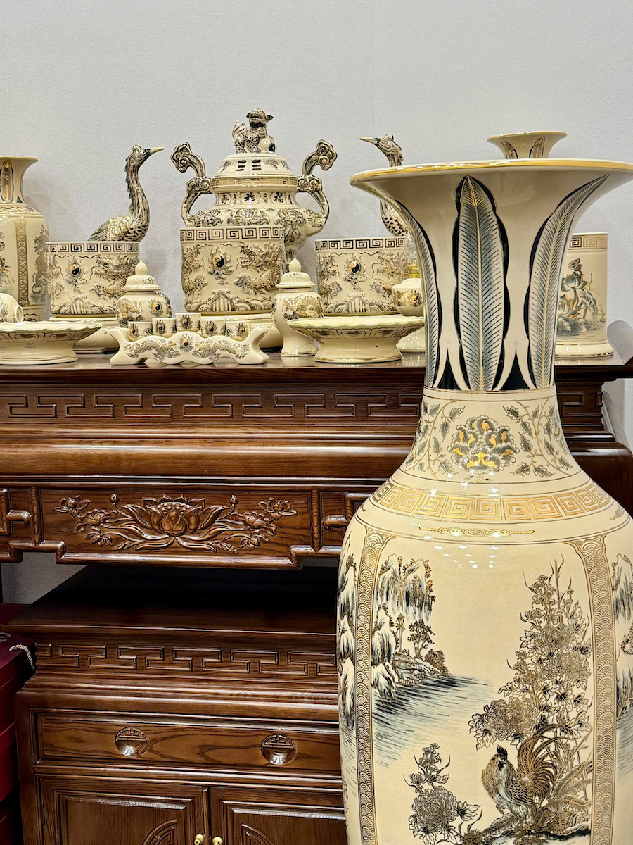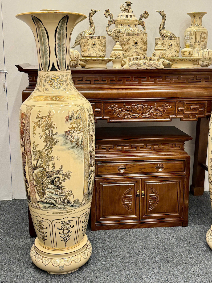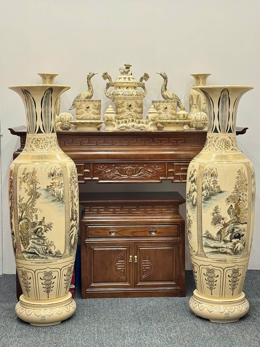 Bộ Đồ Thờ Bát Hương Rồng Đắp Nổi Ban Thờ 1,75m đến 1,97m Gốm Vẽ Vàng